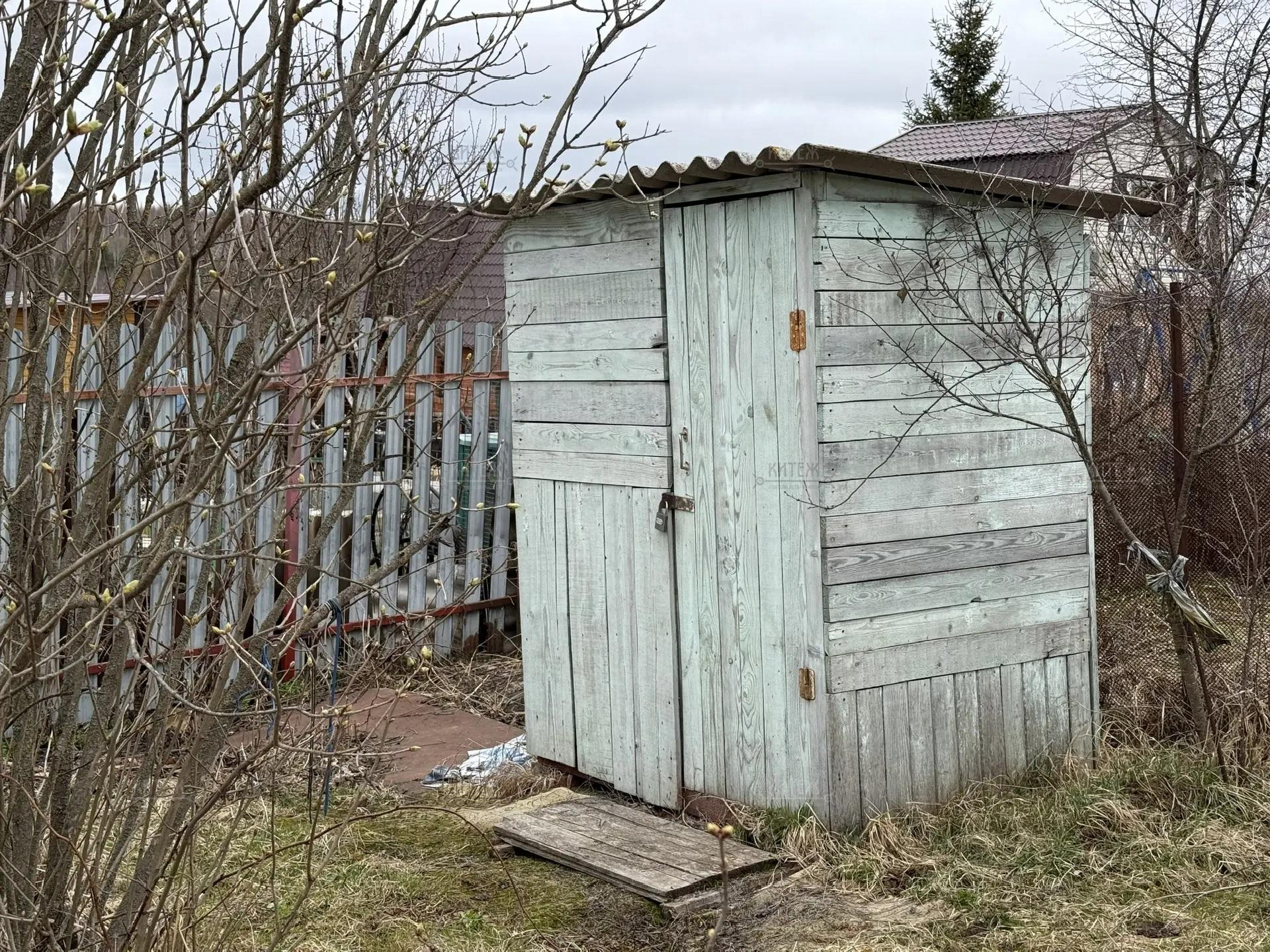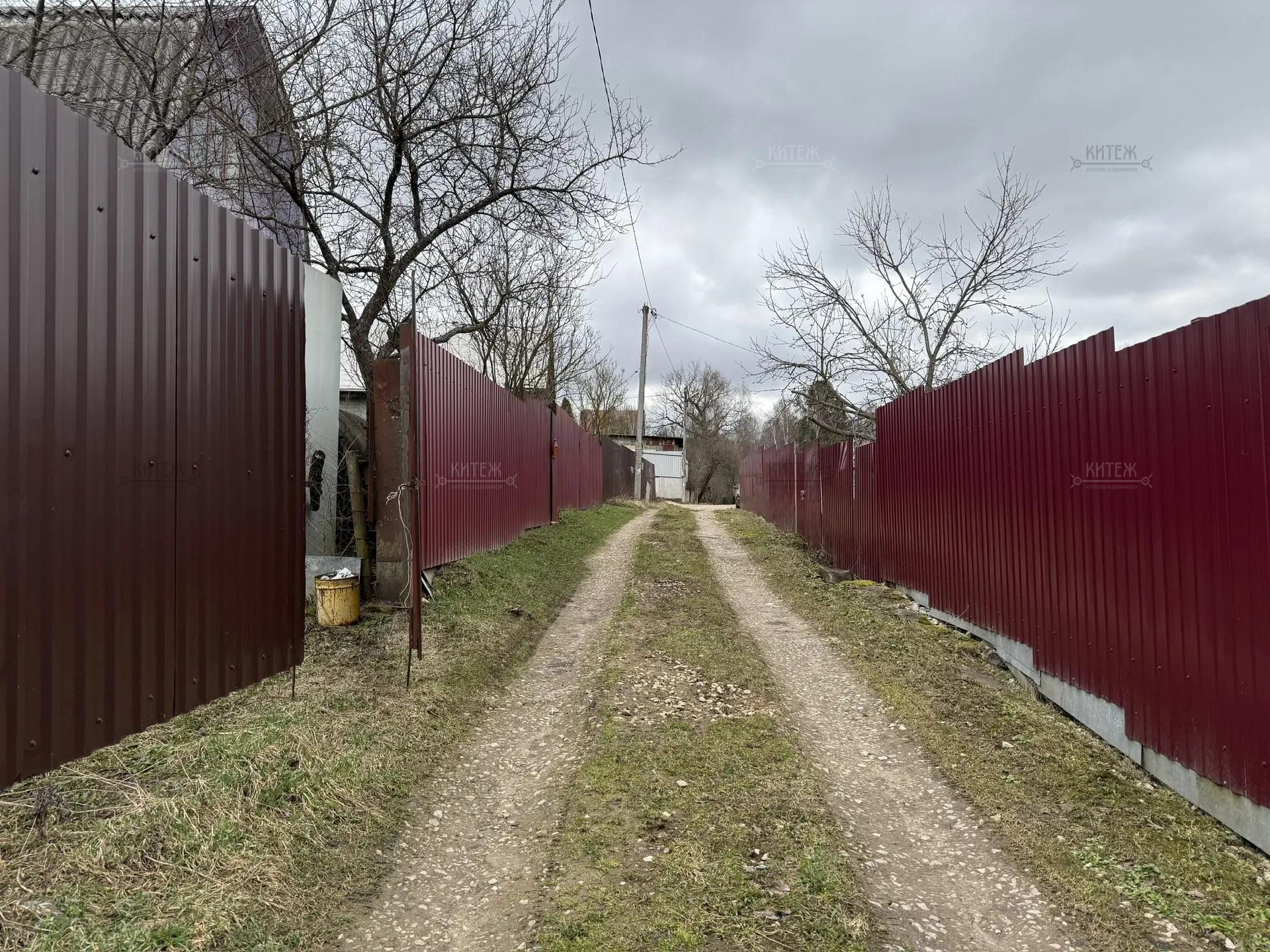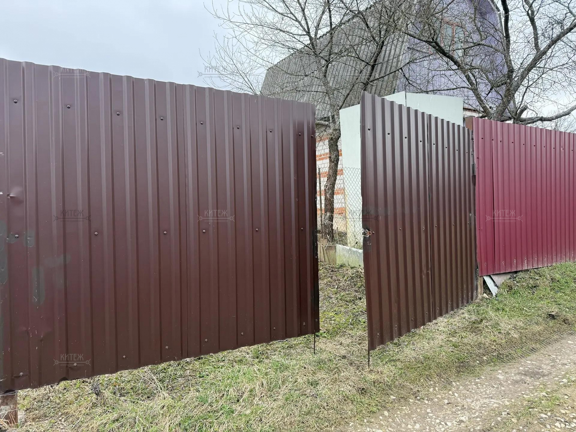 Участок огорожен сеткой рабицей, для въезда на территорию установлены распашные ворота.