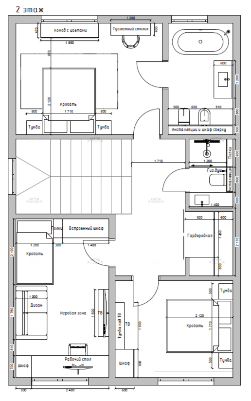 Второй этаж: мастер-спальня 16,7 кв.м. со своим большим санузлом 7,3 кв.м. с окном, две комнаты 15,1 + 11,8 кв.м., ещё один санузел, гардеробная.