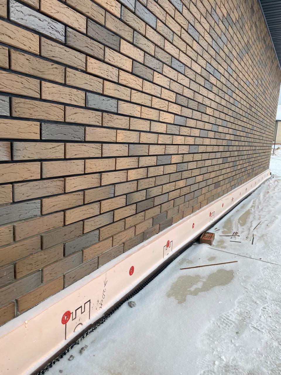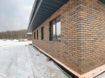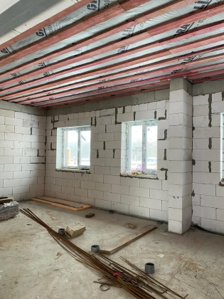 Стены: газоблок 300 мм + утеплитель 50 мм + вентзазор 20 мм + облицовка из кирпича фирмы Braer. Все стены в доме связаны арматурой каждые 3 ряда газоблока.