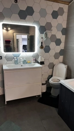 Пол застелен ламинатом высокой категории. В ванной комнате плитка керамогранит, электрический теплый пол. При входе в дом плитка, также с подогревом. Вся плитка «Кеrаmа Mаrаzzi».