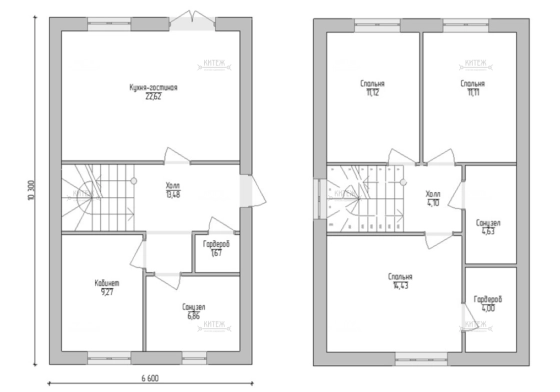 На 1 этаже, помимо центрального холла, располагается гардеробная при входе, кухня-гостиная 22,6 кв.м., кабинет, большой санузел.