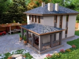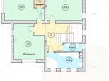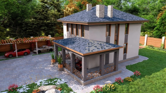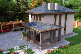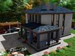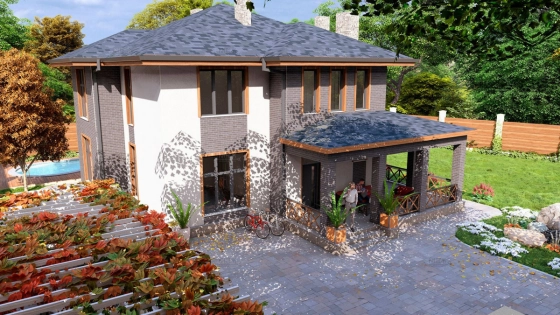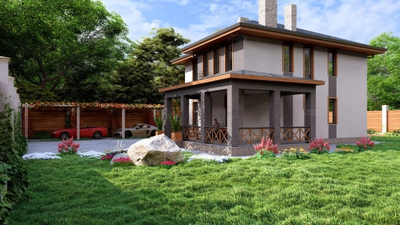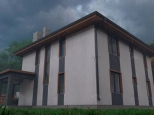Первый этаж: Большая терраса, через которую вход в дом. Просторная кухня-гостиная со своей кладовой. Гостевая спальня или кабинет. Санузел. Бойлерная.