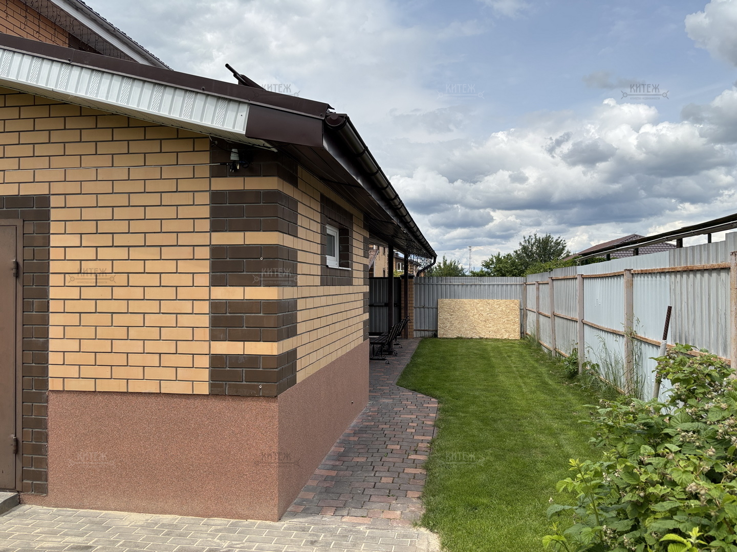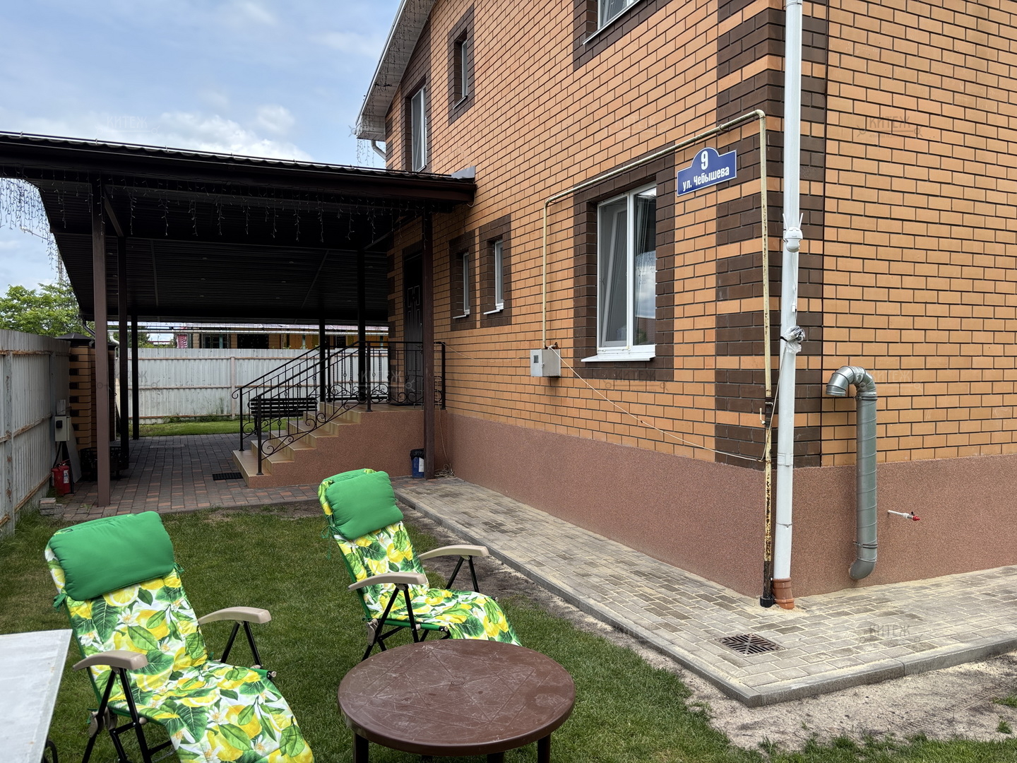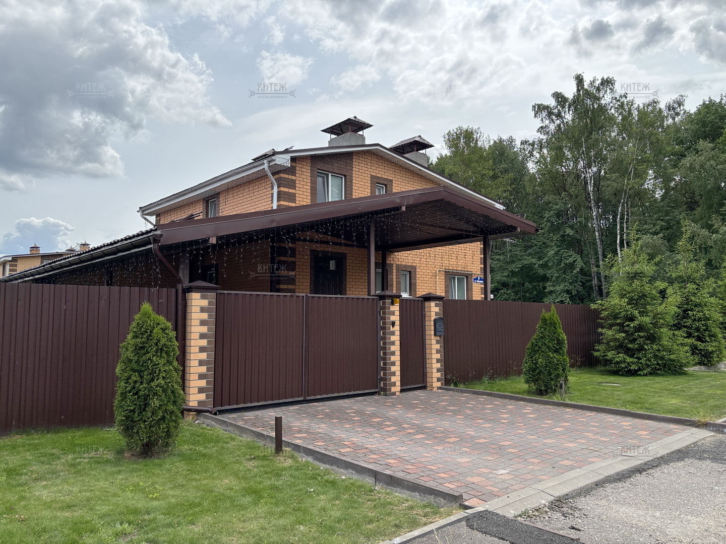 Участок 13,8 соток со всех сторон огорожен забором, при въезде распашные ворота с электроприводом. Перед входом в дом и перед гаражом территория выложена плиткой, сделан капитальный навес с точечным освещением. В остальном на площади участка ровный и мягкий ковёр зелёного газона. На участке ели, туи, парник, грядки, детский спортивный уголок, летний душ, мангальная зона.