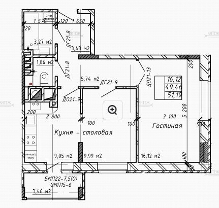 В продаже 2-комн. квартира 51,1 кв.м. с комнатами 16,1 + 9,9 кв.м. и кухней 9 кв.м. Есть техническая возможность убрать стену между кухней и соседней комнатой, получив кухню-гостиную 18,8 кв.м. Раздельный санузел. Застеклённая лоджия 3,5 кв.м. В прихожей ниша под шкаф-купе.