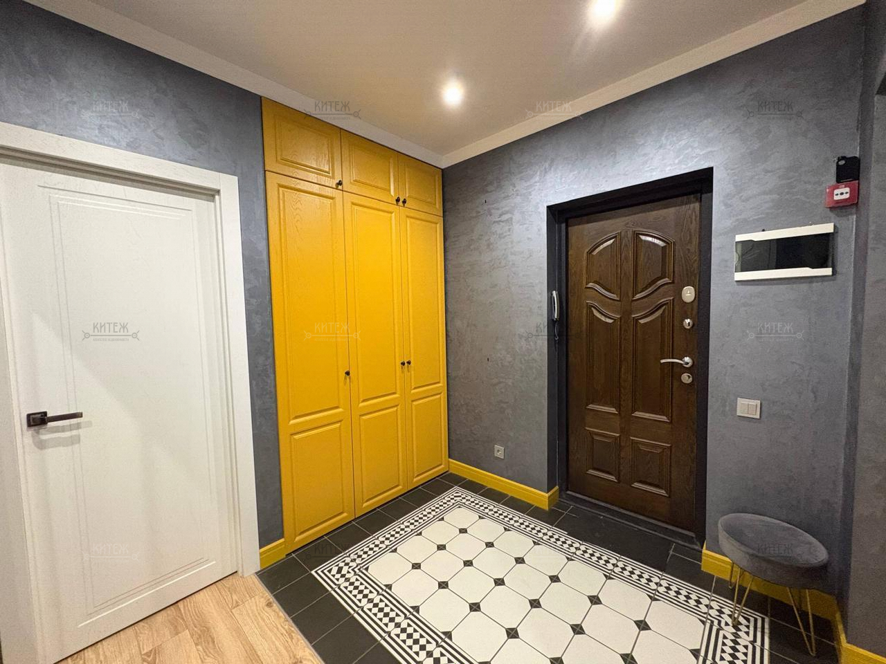 Очень хорошая входная дверь толщиной 110 см, есть встроенные гардеробная.