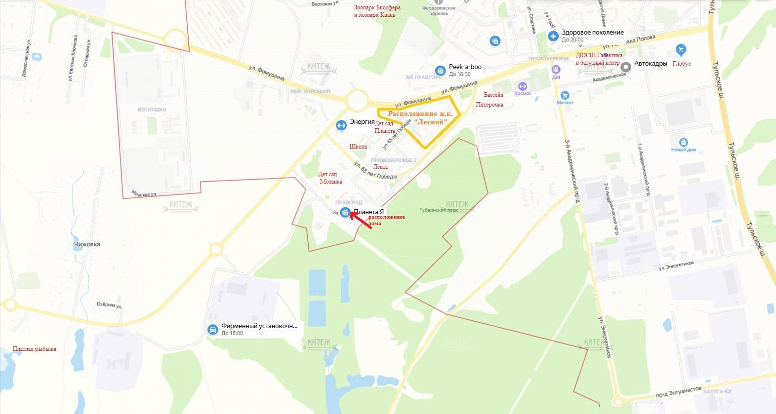 Рядом находятся Губернский парк, соседствующий с 7-ю прудами и сосновым пролеском, горнолыжный центр "Квань" с зоопарком "Биосфера", два бассейна, ледовый дворец, множество сетевых магазинов и детских развлекательных комплексов, гипермаркеты "Лента" и "Глобус".