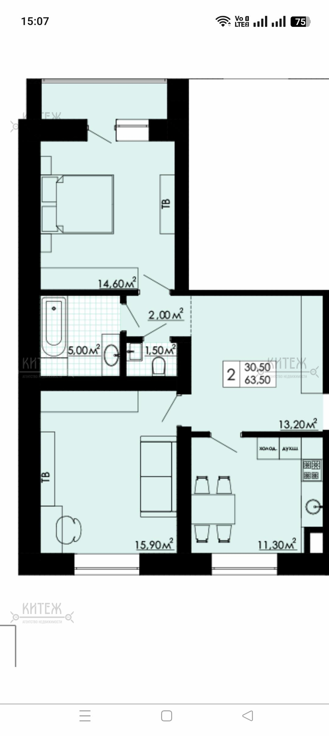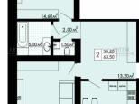 Двухкомнатная квартира отапливаемой площадью 63 кв. и дополнительно лоджия с выходом из спальни .