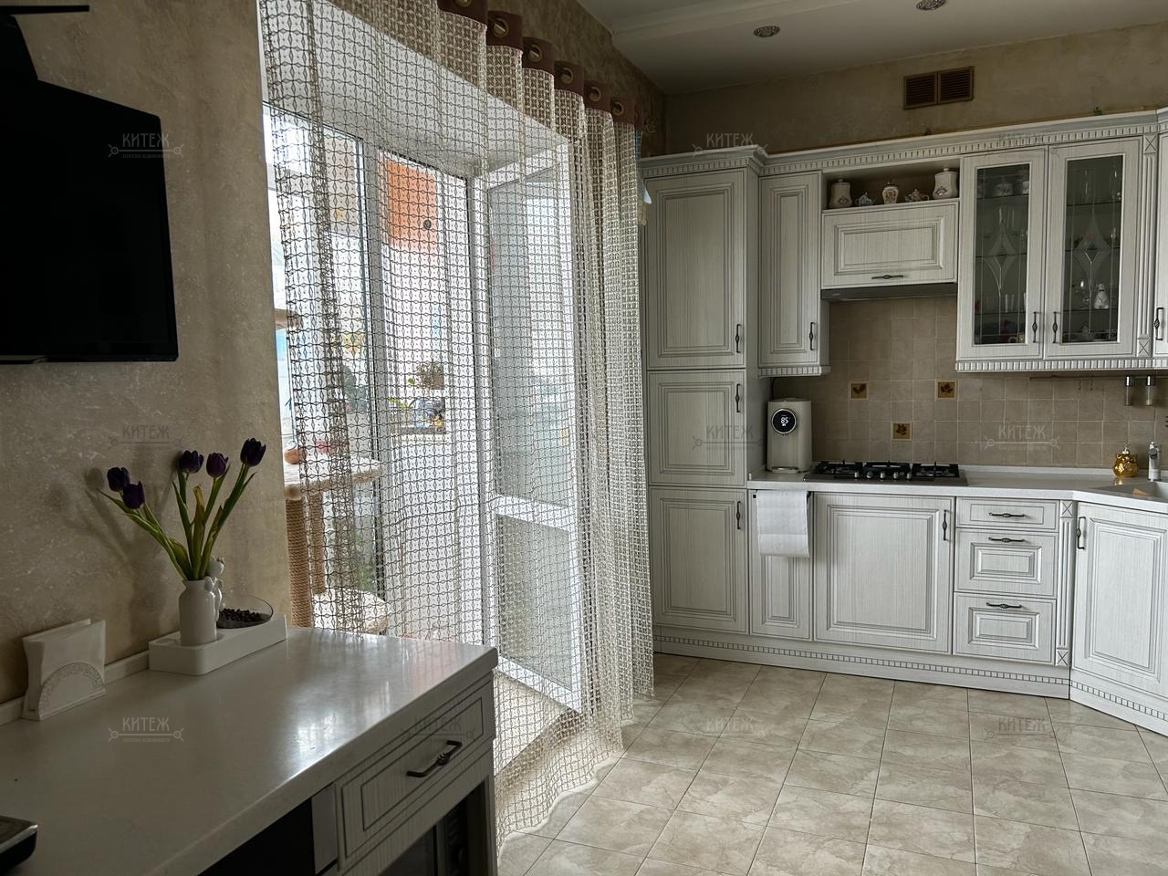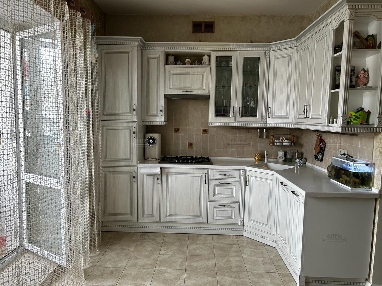 Остаются кухонный гарнитур, гардины и люстры.