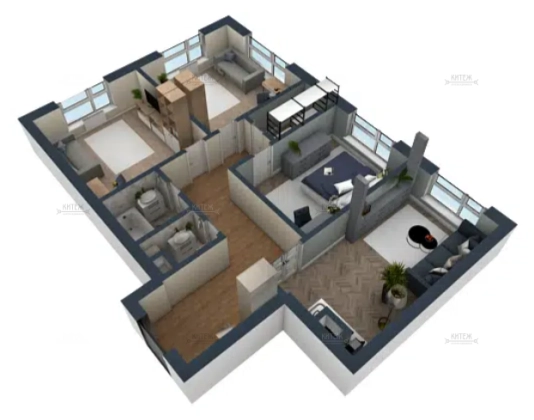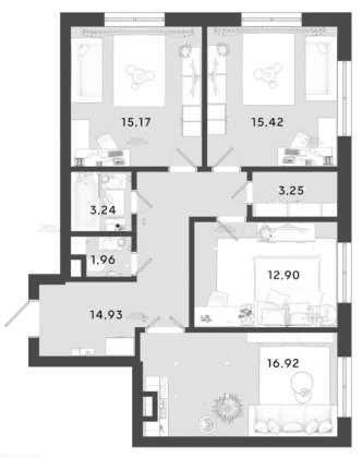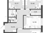 В продаже 3-комн. квартира 83,8 кв.м. с кухней-гостиной 16,9 кв.м. и изолированными комнатами 15,4 + 15,2 + 12,9 кв.м. Раздельный санузел. Отдельная гардеробная. Вместительная прихожая.