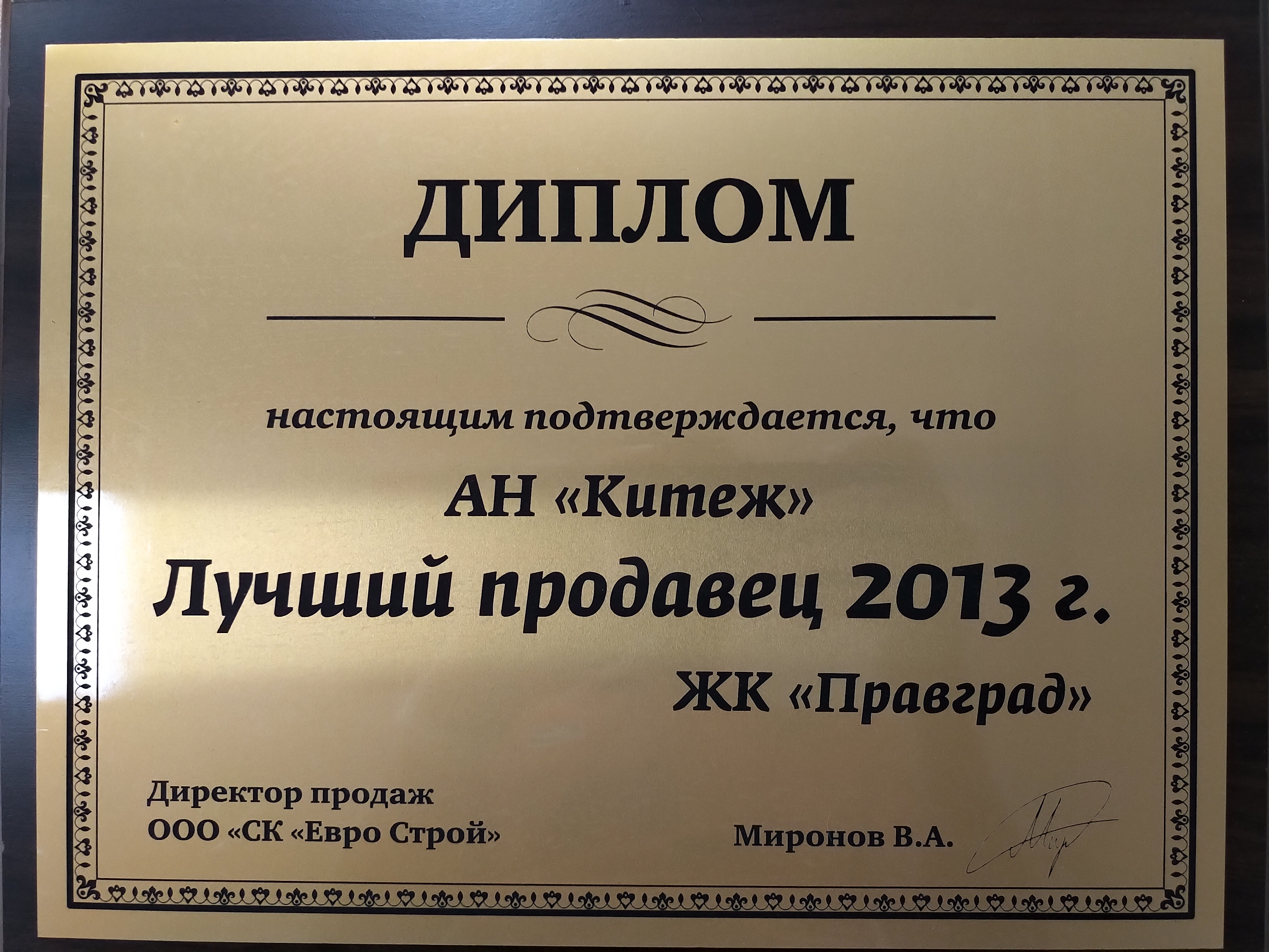 - 2013 год. Лучший продавец 2013 г. в ЖК Правград. ООО "СК "Евро Строй".