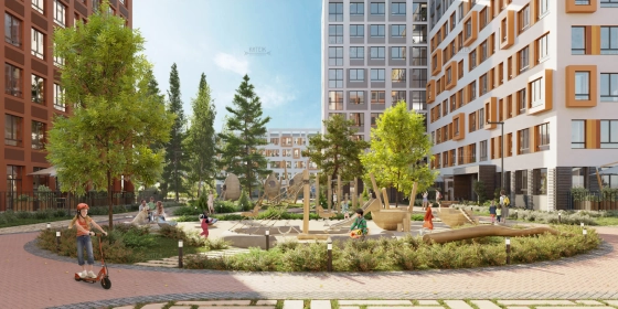 Дворы ОСТРОВОВ закрытые, тихие и уютные. В каждом разместятся детские площадки с нестандартными модулями из природных материалов и теневые навесы. Будет высажено много декоративной зелени, кустарников.